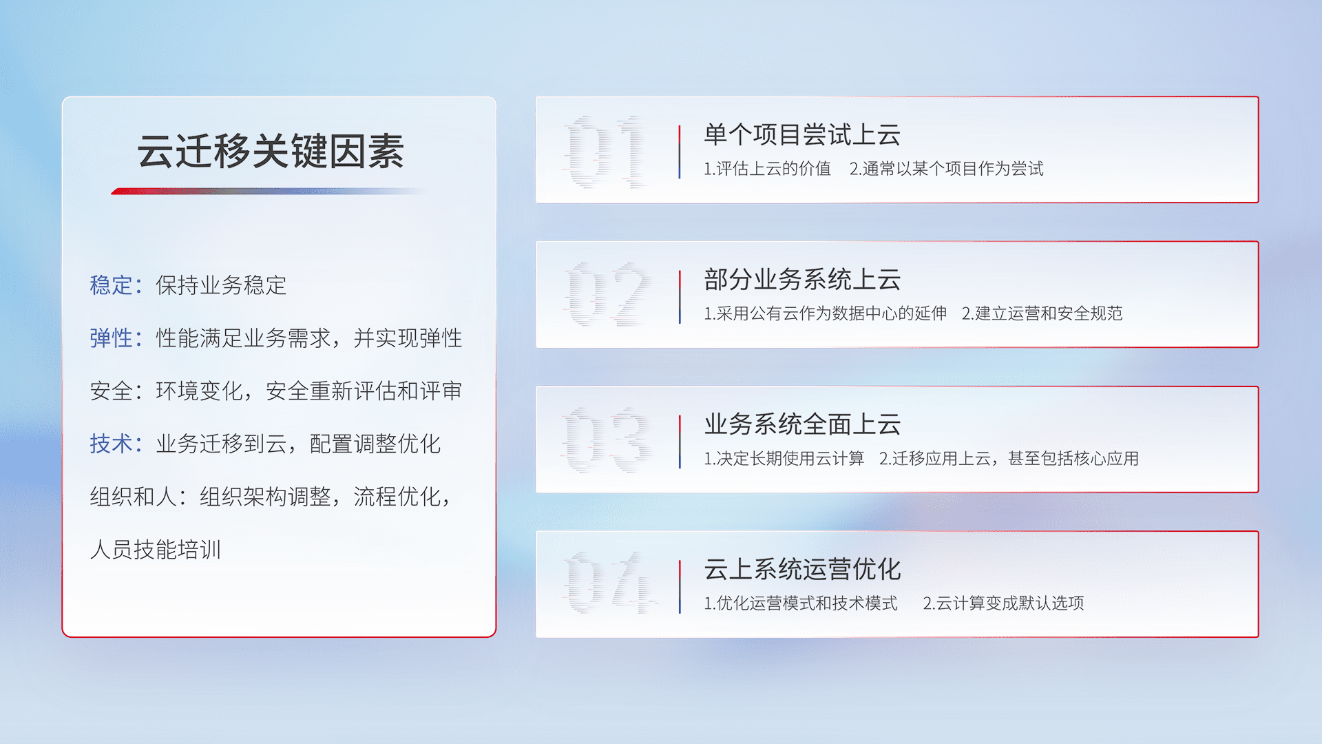 结合实际业务,,,从规划设计、、云平台选型、、云原生改造、、数据迁移、、、集成交付,,,,迁移全过程为客户识别最佳上云路径,,,做好风险识别管理,,,设计网络架构、、、身份权限、、、、安全审计合规、、、操作审计、、、、日志审计、、、监控告警策略、、、多站点容灾设计等,,,对云上基础设施进行整体规划,,,提升IT治理水平,,以满足弹性、、、高可用、、、高性能的需求。。。。