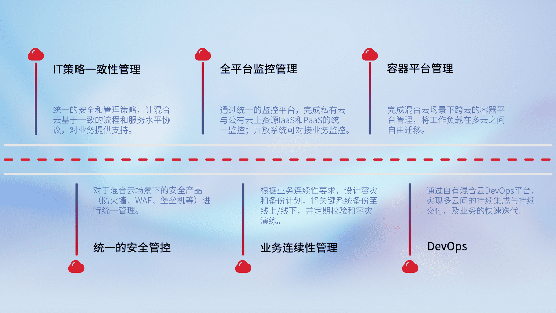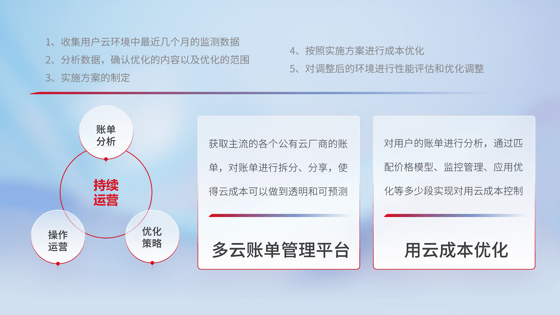 通过多云纳管,,,,以统一的资源数据模型把客户的云资源进行抽象和封装,,,进而实现对多云资源的统一操作,,保障云资源管理的可靠性、、、、稳定性与可用性。。量身定制化运维内容,,配置、、、、开发运维、、补丁管理、、、备份、、监控、、认证和访问管理、、、审计和日常巡检等,,,,保障在用云过程中的可靠度,,稳定度以及高可用率。。。