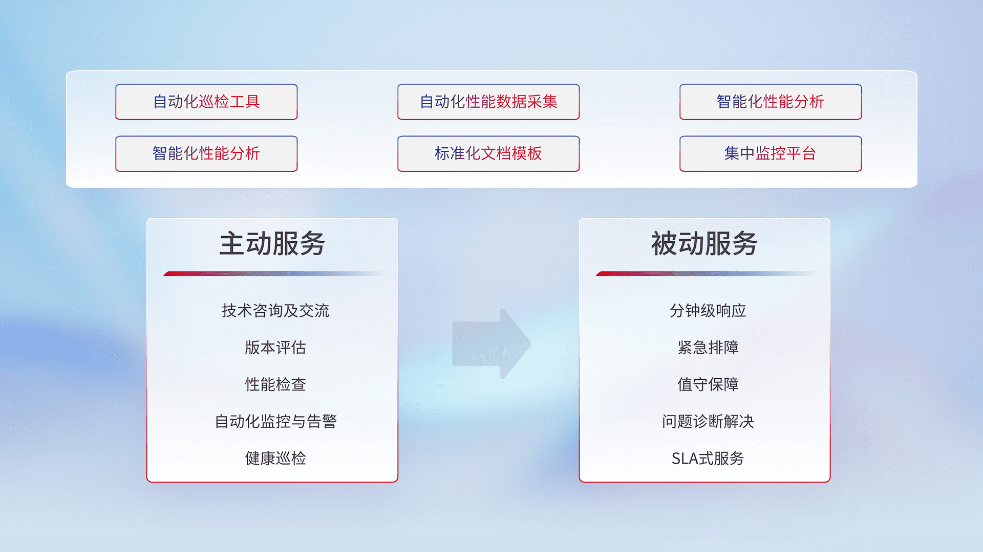 智能化工具和标准化文档,,,,保障服务质量,,,提供主动服务(包含技术咨询、、、版本评估、、、、性能检查、、、自动化监控与告警、、健康巡检)和被动服务包含(分钟级响应、、紧急排障、、值守保障、、、、问题诊断解决、、SLA服务)。。。。