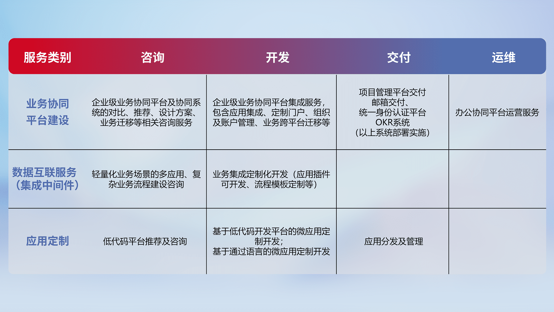 针对钉钉、、企微、、、IDaas等平台级产品提供产品的规划、、、方案、、、、交付、、、、定制化开发等服务,,实现如统一协同办公、、智能客户服务、、、混合会议管理、、、智能数据查询、、、等业务场景,,,实现数字化转型。。。